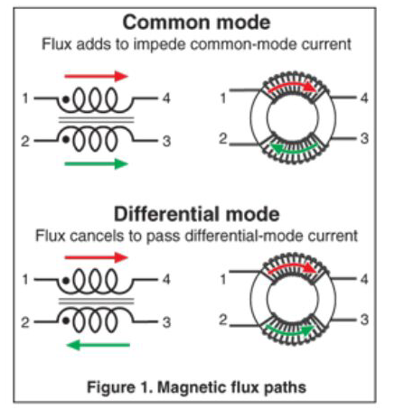 在共同模式下,一組線中的電流沿著相同的方向運(yùn)動,因此組合的磁通會增加一個相反的磁場來阻止噪聲,如圖中所示的環(huán)形磁心中的紅、綠箭頭所示。圖1。在微分模式下,電流沿相反的方向運(yùn)動,磁通會減去或抵消,這樣磁場就不會與正常模式信號相反。